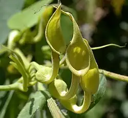 Green and purple tube shaped flowers bloom during July to August, coming out from the axils. Calyx tubes are glabrous and widen to the bottom, and narrowing towards the top they open widely like horns.[3] One side of the lobes lengthen with sharp edges, and the length of the peduncles are 1 centimetre (0.39 in) - 4 centimetres (1.6 in). The flowers do not have floral leaves and consist of 6 stamens and 6 pistils joined as a whole. The ovaries are very thin, long and fragile.