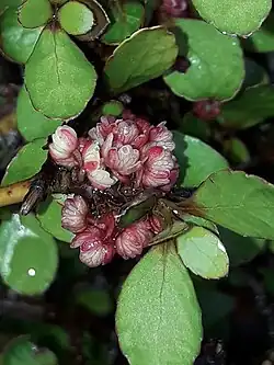 Aristotelia fruticosa, commonly known as the mountain wineberry or shrubby wineberry, is a tree-shrub from New Zealand, in the family Elaeocarpaceae. It grows up to 2 metres (6 feet 7 inches) in a densely branching and divaricating form.[1]