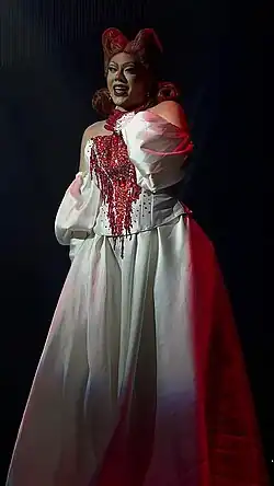 On episode 9, she placed in the bottom three alongside Hana Beshie and ØV Cünt. The three performed a lip-sync to "Dati" by Sam Concepcion and Tippy Dos Santos featuring Quest. Her performance resulted to a double elimination of Hana Beshie and ØV Cünt, securing her spot in the final four,[9] with M1ss Jade So, Bernie and Captivating Katkat.[10] In the final episode, she competed with M1ss Jade So for the second round of the lip-sync smackdown, performing "Who Is She?" by RuPaul. Her performance included a wig change, swallowing her contact lenses, and drinking and pouring liquor on herself. She then battled Captivating Katkat for the crown with their rendition of "Kapangyarihan" by iDolls.[11] She placed runner-up in the competition.