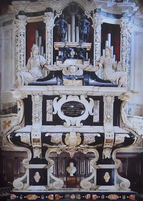 In 1743, on the night of December 2, a fire broke out in the church, destroying the entire choir, the presbytery, the wooden stalls, the organ, the baldachin above the tomb, and all the frescoes in that area of the church.[10] Contemporary accounts suggest that the tomb itself sustained minimal damage, likely limited to the detachment of some marble veneer slabs on the rear, "on the side facing the choir, where the heat was greatest, causing the bitumen holding them in place to melt."[11] Subsequent restoration work evidently altered parts of the tomb's original configuration: in 1744, the following year, the sculptor Antonio Calegari was paid for work done "concerning the statues of the tomb,"[10] while the next year, his son, Santo Calegari the Younger, was paid for similar work.[10] A few months later, an unidentified Antonio Marini was paid for supplying "quick-setting plaster" to restore the tomb, and a gilder, Giuseppe Telarolo, was paid for regilding the inscriptions.[10]