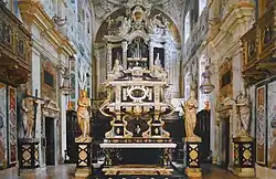 The remains of the city's patron saints, already placed in a marble sepulcher by Bishop Ramperto in the 9th century,[1] were rediscovered in the crypt of the church during major restoration work in 1455.[1] Under Abbot Bernardo Marcello, the "magistro" Tonino from Lumezzane was immediately commissioned to provide a suitable setting. The Ramperto tomb was thus placed at the center of the crypt, replacing the high altar, on six marble columns.[1] The arrangement remained largely unchanged until 1601, when, likely for practical reasons, the crypt was demolished to lower the level of the presbytery, which until then was very high as the crypt was only slightly below ground.[1] According to the diaries of Scipione Covo[2] and the chronicles of Bernardino Faino,[3] upon completion of the floor-lowering work above the crypt on April 2 of the same year, the tomb was simply reassembled adjacent to the high altar of the new choir.