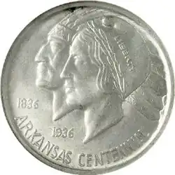 The Arkansas Centennial half dollar is a commemorative fifty-cent piece struck by the United States Bureau of the Mint from 1935 to 1939.[1][2] The coin was designed by Edward E. Burr and commemorates the 100th anniversary of Arkansas's admission to the Union in 1836.[2]