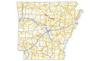 Arkansas Highway 110 (AR 110) is a designation for three state highways in north central Arkansas. One segment of 16.71 miles (26.89 km) runs east from U.S. Route 65 (US 65) at Botkinburg to Highway 9/Highway 16 near Shirley.[3] A second route of 3.15 miles (5.07 km) begins at Highway 16/Highway 92 in Greers Ferry and runs east to the lake shore of Greers Ferry Lake.[4] A third segment of 20.43 miles (32.88 km) begins at the Sugar Maple Dr/Old Tr intersection outside Heber Springs and runs east to Highway 16 in Pangburn.[4][5]