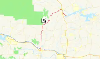 The highway passes through Beverage Town, Scotland and Walnut Grove before entering Clinton. In the city, Highway 95 begins an overlap with U.S. Route 65B (US 65B) heading south. The concurrent routes pass near the Van Buren County Courthouse and Walter Patterson Filling Station, both NRHP-listed properties.[4] US 65B terminates at the parent route, and US 65/Highway 95 run south until Highway 95 splits from US 65 near the Ozark Health Medical Center. The route runs southeast to terminate at Highway 330 near Greers Ferry Lake.[3]