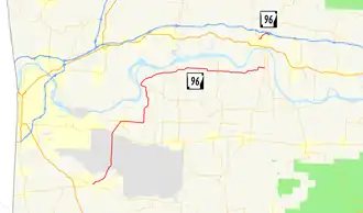 AR 96 begins at AR 10 in Greenwood.[3] The route runs north through Fort Chaffee and crosses AR 22 and AR 255. It continues north then east to cross AR 41 and eventually terminate at AR 23 in Franklin County.[4]