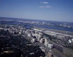 By 1960 Arlington's population had increased sevenfold in the preceding 30 years.[7] Three years later, the industrial and auto-related businesses in the area across U.S. Route 1 to the east of Aurora Highlands began being redeveloped into high-rise condominiums and office buildings, the beginnings of today's Crystal City.[8] As soon as it was built, office space was often leased by defense contractors, taking advantage of the proximity of the Pentagon, and DoD itself to handle satellite and spillover functions. Late in the decade the federal government moved the U.S. Patent Office and the Institute for Defense Analysis to Crystal City.[9]