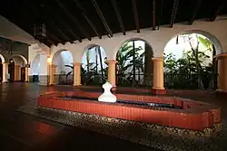 The Arlington was designed in the Mission Revival and Spanish Colonial Revival styles by the local architectural firm Edwards and Plunkett.[3] The exterior features a Mission Revival steeple that ends in an art deco finial, a red tiled roof, and a covered courtyard with a fountain and free-standing ticket booth.