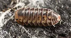 Armadillidae is a family of woodlice (Oniscidea; terrestrial crustaceans), comprising around 80 genera and 700 species. It is the largest family of Oniscidea, and one of the most species-rich families of the entire Isopoda.[1][2] Most of the armadillidae taxa are not monophyletic. Armadillids generally have a strongly convex body shape, with some rather shallowly convex.[3] Like members of the woodlice family Armadillidiidae, armadillids are capable of enrolling into a sphere (conglobation), and are commonly known as pill bugs.[4][5] Some species, however, have secondarily lost their conglobation ability. For example, a species exist in which the males lack the inner face of the coxal plates and are therefore unable to conglobate. [6] Armadillids differ from the Armadillidiidae in that the antennae are fully enclosed within the sphere.[7]