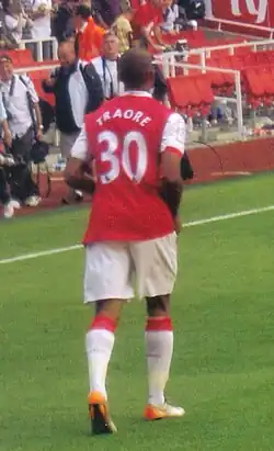 At the beginning of the 2007–08 campaign, Traoré said he wanted to prove his quality to manager Arsène Wenger.[15] Traoré put in numerous impressive performances for the Reserves and even scored a few goals including a spectacular long-range effort against Tottenham Reserves.[16] In September 2007, Traoré returned to White Hart Lane, but this time only as a spectator when he was arrested for carrying knuckle dusters into the stadium.[17] Traoré and a friend were taken into custody for questioning for the duration of the game, and he was given a formal warning. Traoré later apologised the situation and said that he did not know it was wrong because the laws were different in France.[18] At the same month, Traoré set up the club's first goal of the game, in a 2–0 win against Newcastle United in the second round of the League Cup.[19] It wasn't until on 18 December 2007 when he made his first appearance for Arsenal in three months against Blackburn Rovers in the fourth round of League Cup, starting the match and played 120 minutes to help the side win 3–2.[20] Traoré then started Arsenal's FA Cup tie against Burnley, before being replaced by Justin Hoyte in the 71st minute.[21] He played in both legs of the League Cup semi–finals against rivals, Tottenham Hotspur, as the club lost 6–2 on aggregate.[22] After appearing on the bench during the club's 3–1 Premier League victory over Manchester City on 2 February 2008 without making it onto the pitch, Traoré started and played the full 90 minutes against Manchester United at Old Trafford in a 4–0 defeat in the FA Cup fifth round on 16 February 2008.[23] He finally received his Premier League debut on 5 April 2008, against Liverpool, as they drew 1–1.[24] Traoré was used as a left-winger in Arsenal's final two league matches of the 2007–08 season, supplying the cross which led to Nicklas Bendtner's winner against Everton.[25] At the end of the season, he made eleven appearances in all competitions. It was announced on 4 August 2008 that Traoré signed a long-term contract extension with Arsenal.[26]