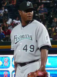 Benítez had a 1.93 ERA, but allowed 14 baserunners in 9+1⁄3 innings over nine games with the Yankees before being traded in a post-deadline waiver deal to the Seattle Mariners for Jeff Nelson.[11] Benitez finished the 2003 season in Seattle. In 2004, Benítez once again became a closer, signing a one-year, $3.5 million contract to join the Florida Marlins.[12] His season with the Marlins ended up being his best season to date; he saved 47 games in 51 chances and compiled a 1.29 ERA. In fact, after giving up a solo home run in his first game of the season, he did not allow another earned run until June 5, an impressive streak of 30 scoreless innings.[13] After the season, Benítez elected to become a free agent, signing a three-year contract with the San Francisco Giants that was worth a reported US$21 million.[14]