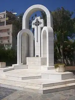In 1989, the Armenian Prelature selected this out of two designs submitted by well-known painter and architect, John Guevherian, and construction started in early 1990. It features three marble arches, representing Armenia, the Armenian Diaspora and Armenians within the former Soviet Union. In the centre of the central arch there is a black granite cross, sculpted by famous Armenian sculptor Levon Tokmadjian, who was a guest at the Melkonian Educational Institute at the time, commissioned to carve a series of busts for pillars of Armenian history and letters. The marble monument is positioned on a raised marble base and bears (from left to right) a Greek, Armenian and English inscription.[1]