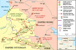 The Russo-Turkish War of 1877-1878 witnessed Russian advances in Ottoman Armenia, with the imperial army successfully capturing Bayazet and Kars[1] between late 1877 and early 1878.[2] As they advanced, irregular Kurdish troops and bashi-bazouks looted and burned several Armenian border villages, leading Armenians in the region to welcome the Russians as liberators.[2] The Russian generals in command of this front—Mikhail Loris-Melikov, Arshak Ter-Gukasov, and Ivan Lazarev—were themselves Armenians.[3]