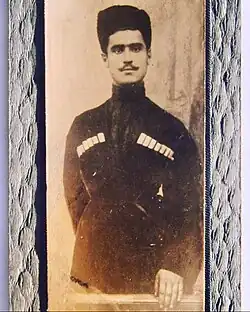 The standard headgear of Eastern Armenians was a fur hat – Papakh (Armenian: փափախ), sewn from sheep's skins.[11] Papakhs came in a variety of different shapes and sizes, with men of different regions and villages having different preferences. Generally speaking, men from Southern Armenia and Karabakh preferred a taller and more cylindrical style of papakh, while men from Northern Armenia usually wore one that was low and wide. The most expensive and prestigious was considered to be made from Bukhara sheep wool, which was worn by representatives of the wealthy classes, especially in cities. In these cities, very high, close to cylindrical, hats were worn complete with a chuhka with folding sleeves. The headgear and hat, in particular, were the embodiment of the honor and dignity of an Armenian man. Throwing his papakha on the ground was equated to his shame and dishonor. According to traditional etiquette, in certain situations, the man was supposed to take off his hat at the entrance to church, during funerals, when meeting highly revered and respected people, etc.[1]
