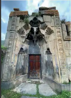 Perhaps one of the most characteristic decoration techniques of the time was stalactite vaulting (muqarnas), which was widely used both in small decoration elements (cornice, entrances and window frames) and in monumental compositions (skylight of the gavits, staircases, corner section of the walls), forming an illusion of a constructive element.[11] Perhaps the most impressive is the design of the portals (Neghuts monastery, the gavit of the Church of the Holy Apostoles of Ani.