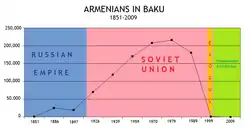 Their numbers remained strong into the 20th century, despite the turbulence of the Russian Revolutions of 1917, but almost all the Armenians fled the city between 1988 and January 1990.[7] By the beginning of January 1990, only 50,000 Armenians remained in Baku compared to a quarter million in 1988; most of these left after being targeted in a pogrom that occurred before the dissolution of the Soviet Union and the early stages of the first Nagorno-Karabakh War.[8]