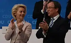 In January 2021, Laschet was elected leader of the CDU, winning 52.8% of delegates votes against Friedrich Merz in the second round of the contest.[1] The result of the election was certified by postal vote of the party conference's delegates with the final result announced on 22 January. It was confirmed on 20 April 2021 that he would be the CDU/CSU candidate for Chancellor of Germany at the 2021 German federal election, after rival Markus Söder conceded.[2]