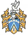 Buckingham, granted November 1986 Escutcheon: Azure a Pall reversed between in chief two Bucks Heads caboshed Gold and in base three Bars Wavy Argent Note: The university uses the swan (a symbol of Buckinghamshire) of its crest as a logo. | |