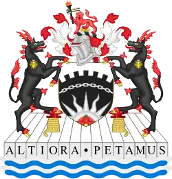 Escutcheon: Azure, five lozenges conjoined in bend Or; on a chief argent, an open book proper, bound gules edged Or, between two hammers erect sable. On the chief the book represents learning and the ball-pein hammers the connection with metalwork industry. The mural crown in the crest is used by public bodies. The laurel wreath represents academia and also a link to Birmingham.[48] The five lozenges reference the arms of the city of Birmingham. |
