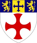 Escutcheon: Argent a Cross Pattée quadrate Gules; a Canton Azure charged with a Chevron Or between three Lions rampant of the First. The arms feature St Cuthbert's cross, referencing the link to Durham Cathedral (the shrine of St Cuthbert) and, in the canton, the arms of Bishop Hatfield of Durham, the founder of Durham College, Oxford, advancing the idea that the university is its successor institute.[26][27] St Cuthbert's Cross was used as the university's seal prior to the grant of arms and appears on the coats of arms of many Durham colleges, as well as those of Newcastle University. |