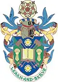 Escutcheon: Azure an open book Proper edged Gold inscribed with the words "DISCE DOCE" between in fess two sheaves of eight arrows interlaced saltireways and banded Argent in chief an open crown Or and in base a rose also Argent barbed and seeded Proper. The open book inscribed with Disce Doce (Learn and Teach) is self-explanatory. The sheaves of eight silver arrows are from the arms of the city of Sheffield. The gold crown is a 'crown of success' i.e. an emblem of achievement and the white rose represents Yorkshire.[44] | |