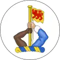 Crest: "A demi-lion rampant guardant supporting in the paws a staff proper, thereon flying to the sinister a banner azure, charged with three imperial crowns."