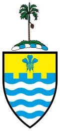 Shield: Tierced per pale, The first (at dexter) per fess embattled Or and barry wavy of eight Azure and Argent in chief a plume of three ostrich feathers surmounted by a riband of the Second on the riband the words Ich Dien in letters of the First; the second (at fess point) quarterly Argent, Gules, Sable and Or; the third (at sinister) Azure, a representation of the gate of A Famosa Proper; and a chief Gules, five krisses in their sheaths, per pale Or.