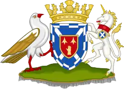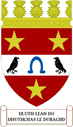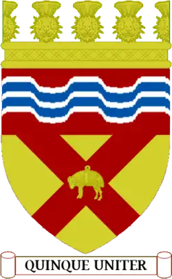 Blazon: Per fess in chief per pale Azure and Vert in base Azure in chief a pale Or charged of a lymphad sails furled and oards in action Sable flagged Gules all between dexter a castle triple-towered and embattled Argent masoned Sable windows and port Gules and sinister a boar's head erased holding in its mouth a shank-bone of a deer Argent and in base a stag's head cabossed Or overall on a fess wavy Argent a barrulet wavy Azure. |