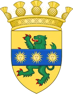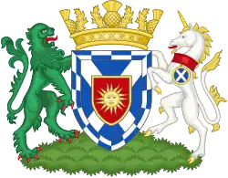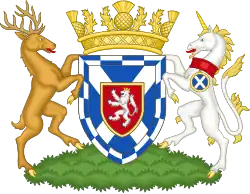 Blazon: Argent on a mount in base a stag lodged reguardant in front of an oak tree all Proper the tree charged of an inescutcheon of the arms of the Earl of Lauderdale (Or a lion rampant Gules couped at all his joints of the field within the Royal Tressure Azure). |