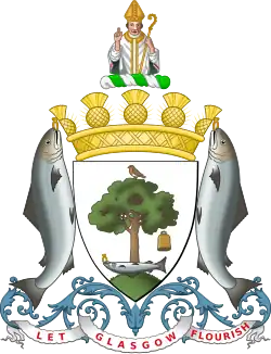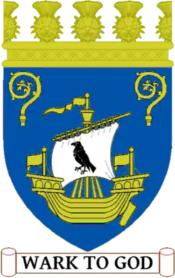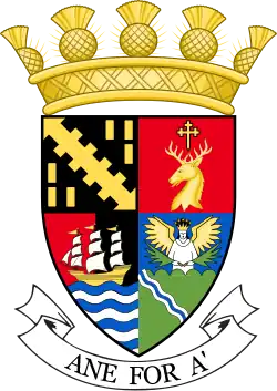 Blazon: Quarterly 1st Gules three crowns of myrtle Or 2nd Argent on a mount in base the figure of St Andrew Proper bearing his cross in front of him Argent 3rd Argent on a base undy Azure and Argent a lymphad sails furled Sable flagged Gules 4th Gules in chief a garb Or banded Vert in base a plough also or share Argent. |