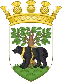 Blazon: Argent on a mount Vert a bear Sable collared and chained Or standing in front of a tree Proper. |