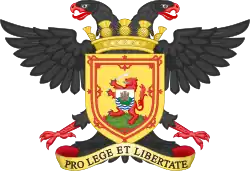 Blazon: Argent a double-headed eagle displayed Sable beaked and membered Gules surmounted of an escutcheon Argent charged with a saltire Sable and surcharged in the centre with a hurcheon Or within a bordure Gules charged with five estoiles Or on a chief wavy Azure and endorse Or between dexter the demi-figure of the Archangel Michael wings expanded brandishing in his dexter hand a sword all Proper and on his sinister arm an escutcheon Argent charged with a cross Gules and sinister on a rock in base Proper a double-leaved gate Gules triple-towered on an ascent of five steps flanked by two towers all Argent towers arch-roofed and masoned Sable vanes Gules. |