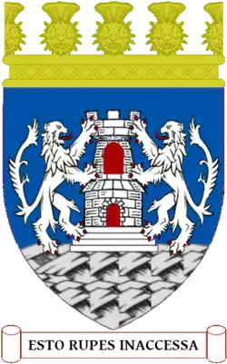 Blazon: Argent a castle triple-towered and embattled Sable masoned of the first and topped with three fans Gules windows and portcullis shut of the last situated on a rock Proper. |
