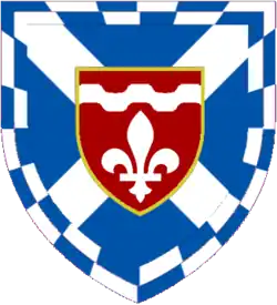 Blazon: Azure a saltire Argent surmounted at the fess point by an inescutcheon Gules fimbriated Or and charged with a fleur de lis Argent and in chief a bar wavy of the last a bordure counter-compony of the first and second. |