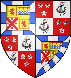 Quarterly: I and IV azure three fleurs de lys or, a bordure gules with eight buckles or; II and III or, a fess chequy argent and azure of three rows (Stuart) a bordure engrailed gules; sur le tout argent, a saltire gules, between four roses of the same, seeded or and barbed vert (Lennox).
