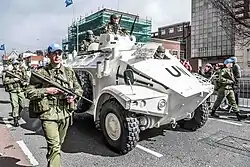 Six M113 armoured personnel carriers were loaned to Irish troops in the Congo operating as part of the UN force ONUC. The M113s were United States Army vehicles donated to the UN for the Congo peacekeeping force mission.[31] Following the withdrawal of Indian Army soldiers due to the Sino-Indian War, Irish from the armoured car group took over responsibility for their position in Jadotville assuming control of six M113s and several Swedish APCs.[32] The M113 APC was a significant improvement over the Ford armoured cars and Swedish APCs used by the Irish forces up to then; easy to handle, tracked, amphibious and armed with a pintle-mount M2 Browning .50 machine gun. The vehicles were withdrawn early from the armoured car group in the Congo and returned to US Army inventory.[32]