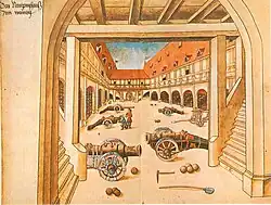 Maximilian I had the Armoury built from 1500 to 1505 on the Sill which was then in front of the gates of the town. It consists of two 80 x 10 m, two-storey wings and two narrow gatehouses and blocks that surround a large inner courtyard. Materiel for war was stored here and, around the Armoury, were subsidiary buildings. As well as cannon, many small arms were also stored here.