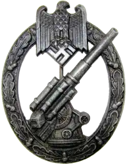 Criteria for the award came from a recommendation by commanders of the rank of General der Artillerie or above.[3] It was awarded after the accumulation of 16 points or could also be awarded outside of the points system for an act of merit or bravery in the performance of anti-aircraft duties.[2][3] If the candidates' battery brought down an enemy aircraft then the crew members were awarded four points.[3] If two batteries were involved then each battery received two points.[1] Both officers and crews were eligible for the badge. The commanding officer for an anti-aircraft unit was eligible for the badge once half of his men also qualified for the badge.[2][4] Unlike the similar German Air Force Anti-Aircraft Flak Battle Badge (Flak-Kampfabzeichen der Luftwaffe), points were only awarded for the downing of aircraft and not ground targets.[5] The award was also available to searchlight crews and sound-locator crews.[4] German Army searchlight crews and sound-locator crews which assisted in the action by detection of aircraft could be awarded one point each.[4]