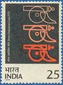 - 1954 – After India became a republic in 1950, the prefix "Indian" was dropped and the Corps was renamed the Army Ordnance Corps. The modified crest is similar to the previous one of 1922. It contained three cannon balls and three field pieces on a circular shield. The crown was replaced by the national emblem of India with a pair of crossed swords at the bottom.