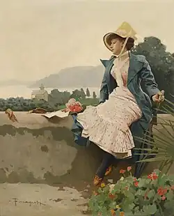 In 1891, he married Olga Treves, granddaughter of the publishers Emilio and Giuseppe Treves and was employed to illustrate their magazine L'Illustrazione Italiana.[1] He erected a villa in Pallanza where he taught painting, and attended salons in the nearby Villa Cordelia of Giuseppe Treves. He died in Forlì in 1925.[2]