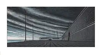From this serene series of images diverge the views of a square on the sea to be realized in Livorno, perhaps within the framework of the plan developed by Marcello Piacentini. Like others dating back to the late 1930s and early '40s, these drawings have in fact a different character, the same one that can be found in contemporary letters of correspondence: the palette of colors goes out, the views are magnified in utopian visions, military buildings are prevailing (barracks, customs, monuments to the fallen united by the title "Guard at the Borders"). More and more evident is the influence of contemporary German architecture (especially Wilhelm Kreis and Albert Speer), together with that properly neoclassical by Pasquale Poccianti (Poccianti's "Cisternone", made in Livorno in 1829–1942, is a visionary work comparable to the "revolutionary" architecture of Étienne-Louis Boullée). This gloomy and introverted style, well represented by these last images, perhaps explains also the voluntary departure of Dell'Ira for the Russian front.