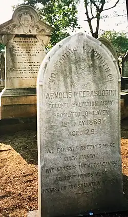 Arnolis (Arnold) Alexander Weerasooriya (Sinhala :අර්නෝලිස් වීරසූරිය; 20 September 1854 – 18 May 1888)[1] was the first Ceylonese Colonel of the Salvation Army, also serving as Second in Command of the Indian sub-continent 1887–1888.[2] He was a member of the Weerasooriya family of Dodanduwa and Hikkaduwa,[3] and he is understood to be the first Sinhalese member of the Salvation Army.[4][5][6][7][8]