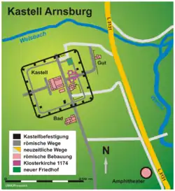 The area then disappeared from history until the Middle Ages. In between, it was settled by the Franks but whether there was a continuity of use of the Arnsburg area is unknown.[2] Research is currently under way in this regard with excavations at Villa Arnesburg, a place mentioned in 1151 and 1174. This village was later abandoned (Wüstung) but may have been a local place of settlement in late Antiquity, bridging the abandonment of the castrum and the building of the castles.[3]