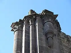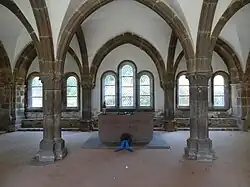 The cloister, or inner yard, is surrounded by the Bursenbau, the church ruin, the main abbey building (1775), and the early Gothic eastern wing (Ostflügel) that housed the dormitory for the brothers on the upper floor and the chapter hall, which doubled as the burial site of the abbots, on the lower floor. The former was demolished in the 19th century, but has been reconstructed and now serves as a venue for concerts. The latter has become part of the war grave cemetery, with a memorial to the war dead. The war cemetery now occupies the cloister, where rows of graves are interspersed with crosses made of Basaltic tuff.[26]