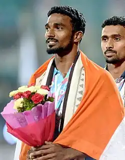 Subedar Arokia Rajiv (born 22 May 1991) is an Indian sprinter and a Junior Commissioned Officer (JCO) in Indian Army who specialises in the 400 metres distance. He won silver medals in the men's and mixed 4 × 400 m relays at the 2018 Asian Games and placed third in the individual 400 m in 2014. He won medals in both the 400 m and 4 × 400 m events at the 2016 South Asian Games and 2017 Asian Championships. He competed in the relay at the 2016 Summer Olympics.[2] He competed in the 2020 Tokyo Olympics in the Men's 4 × 400 m relay event where the Indian team broke the Asian and National Records and clocked a time of 3:00.25.[3]