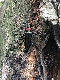 Aromia bungii, commonly known as red-necked longhorn beetle, is a species of wood-boring beetle belonging to the family of longhorn beetles (Cerambycidae) that is native to eastern Asia. It was described by the entomologist Franz Faldermann in 1835 from Mongolia.[1] It is common and native in different parts of China and South Korea and has been reported from the neighboring parts of Vietnam, North Korea and far eastern Russia.[6][2][7] Further, the beetle is invasive in Europe (first record in 2010) and Japan (first record in 2012), spreading with wood-packing materials and through infested nursery plants. As of 2025, infestations in Europe have been reported from different regions in Italy as well as from southern Germany.[8][9][10] A. bungii is a pest of live fruit and ornamental trees from the genus Prunus (Rosaceae), in particular peach, cherry, plum and apricot trees. The larval stages feed mainly under the bark on the sapwood but can also bore into the heartwood. The infestations can cause considerable damage, with heavy attacks resulting in a reduction of fruits and growth, up to tree death. More than 50% of the trees in an orchard may be affected. For preventing infestations, painting a lime-sulfur mixture or other substances on the bark is practiced. Other management options include the use of pesticides and traps. In invaded areas, monitoring and quarantine procedures to prevent further spread is important.[6] The adult beetles are around 25-35 mm long and can be recognized by the combination of the reddish pronotum and shiny black elytra. The red pronotum by itself is not sufficient for identification as some forms of the related species Aromia moschata also have a red pronotum.[11] The females lay eggs in cracks in the bark, mainly at the base of the trees. Upon emerging from the eggs, the larvae tunnel into the trunk. They are whitish and reach a length of up to 50 mm when fully mature.[12]