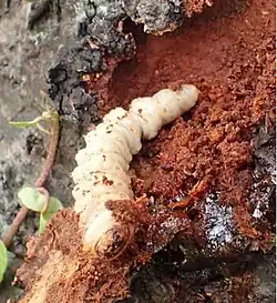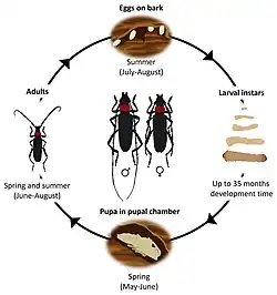 The larvae initially feed on the phloem, but later also infests the xylem and often pupate there. The development of the larvae in the trunks involves several larval stages, the exact number is unknown. The mature larvae reach a length of 40 to 50 mm.[12] In warmer regions like southern China, the larval development may be completed by spring of the following year when the larvae pupate and the adults emerge by early summer. However, in more temperate regions like central and northern China, one life cycle lasts for 2 or 3 years and larvae overwinter in those regions.[6]