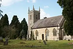 The parish church of the Holy Trinity consists of a chancel with a north chapel and vestry, nave, north aisle, and west tower. The building dates from the 12th century, but the only evidence of this period is the south doorway, which may have been reset at a later period. The nave has windows of the end of the 13th century, and the chancel appears to have been rebuilt from early-to mid-14th century. The west tower is said to have been added or rebuilt in 1767. In the tower is one bell by Henry Bagley, 1657. The north aisle was added in 1865 and the rest of the building restored. The nave (49 ft. by 20 ft.) has a north arcade of three bays. In the south wall are three windows: the easternmost dating from about 1300. The west wall has a Tudor doorway. There are several tombs within the church of the Conway family, for centuries Lords of the Manor here, including Henege, an infant son of Edward Conway, who died in 1660. In the village church is a statue of one of the Marquesses sculpted by Prince Victor of Hohenlohe-Langenburg, a nephew of Queen Victoria.[7] There is a churchyard surrounding the church.