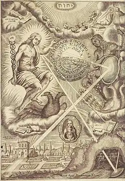 The frontispiece for the book by Pierre Miotte combines the physical, metaphysical and allegorical qualities of light.[6]: 101 It depicts three realms, the divine, the starry and the earthly. In the divine realm the name of God appears in the Hebrew tetragrammation, surrounded by the nine orders of angels. Immediately below this are represented the two highest means by which humans can understand God's plan, sacred authority ('auctoritas sacra') and reason ('ratio').[4]: 23–28