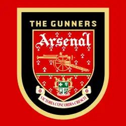In 1949, the club unveiled a modernised crest featuring the same style of cannon below the club's name, set in blackletter typography, and above the coat of arms of the Metropolitan Borough of Islington and a scroll inscribed with the club's newly adopted Latin motto, Victoria Concordia Crescit (VCC) – "victory comes from harmony" – coined by the club's programme editor Harry Homer.[109][110] For the first time, the crest was rendered in colour, which varied slightly over the crest's lifespan, finally becoming red, gold and green. Because of the numerous revisions of the crest, Arsenal were unable to copyright it.[111] Although the club had managed to register the crest as a trademark, and had fought (and eventually won) a long legal battle with a local street trader who sold "unofficial" Arsenal merchandise,[112] Arsenal eventually sought a more comprehensive legal protection. Therefore, in 2002 they introduced a new crest featuring more modern curved lines and a simplified style, which was copyrightable.[113] The cannon once again faces east, and the club's name is written in a sans-serif typeface above the cannon. Green was replaced by dark blue. The new crest was criticised by some supporters; the Arsenal Independent Supporters' Association claimed that the club had ignored much of Arsenal's history and tradition with such a radical modern design, and that fans had not been properly consulted on the issue.[114] Until the 1960s, a badge was worn on the playing shirt only for high-profile matches such as FA Cup finals, usually in the form of a monogram of the club's initials in red on a white background.[115]