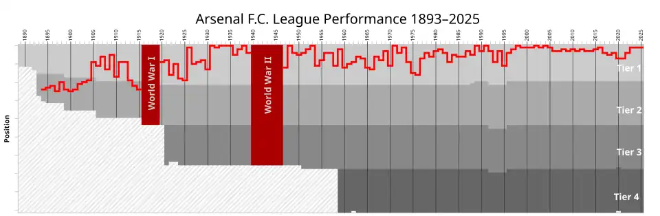 Arsenal was the first club from southern England to join the Football League in 1893, and it reached the First Division in 1904. Relegated only once, in 1913, it continues the longest streak in the top division,[3] and has won the second-most top-flight matches in English football history.[4] In the 1930s, Arsenal won five League Championships and two FA Cups, and another FA Cup and two Championships after the war. In 1970–71, it won its first League and FA Cup double. Between 1989 and 2005, they won five league titles and five FA Cups, including two more doubles. They completed the 20th century with the highest average league position.[5] Between 1998 and 2017, Arsenal qualified for the UEFA Champions League for an English football record nineteen consecutive seasons.[6]